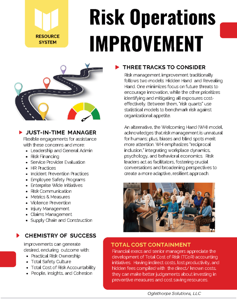 Our practice group supports development and evaluation of risk operations, cooperative risk financing, and risk control. We serve as a trusted advisor for internal teams and advance owner interests with external service providers. We can build, shape, and transform risk management architecture with a growth at quality mindset. We educate, foster ingenuity, and help organizations achieve total cost-of-risk reduction through resource systems and custom programs.