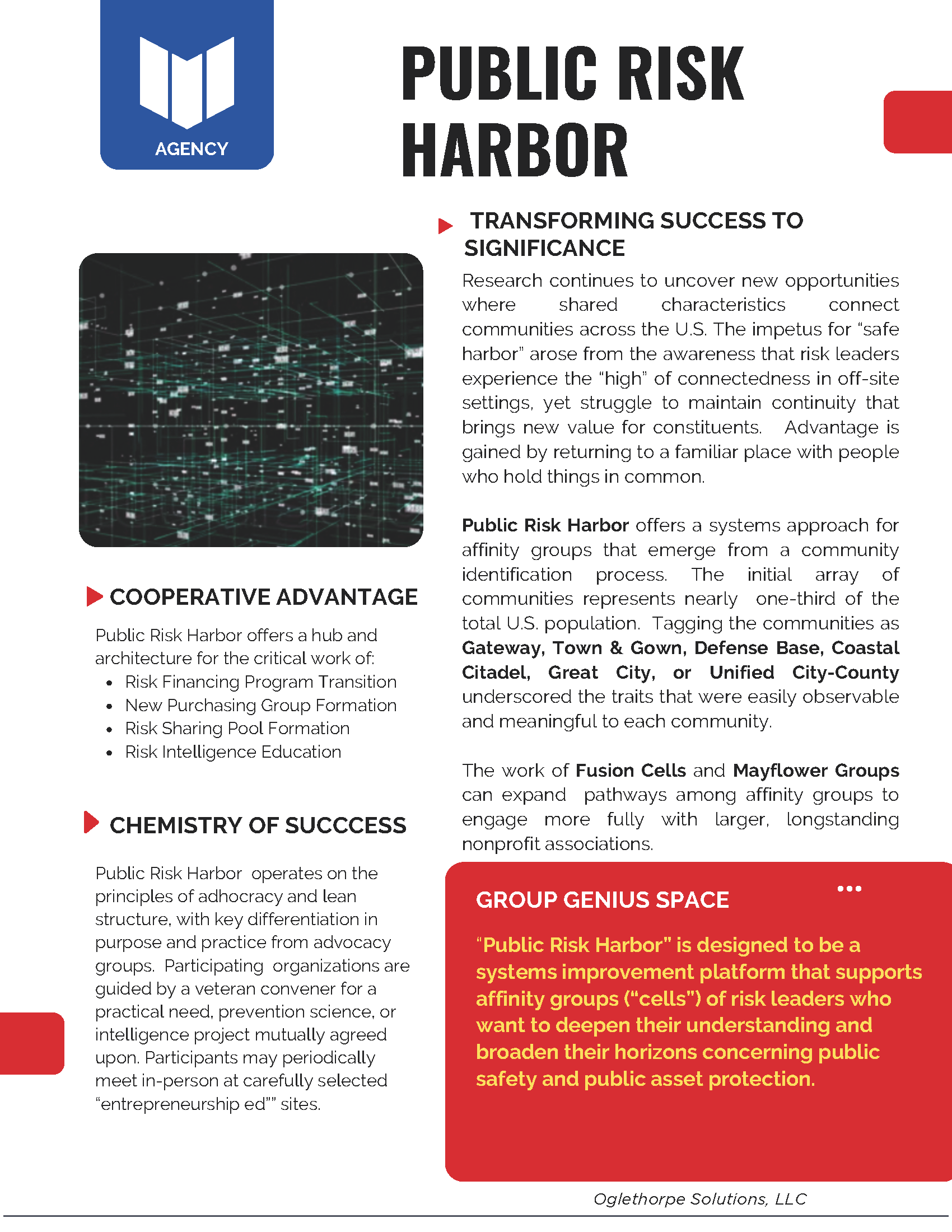 Risk owners in the public entity arena face challenges transforming success in some elements of risk management into significant savings in the total cost of community risk. We help affinity groups accelerate whole system improvement through cooperative efforts.